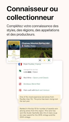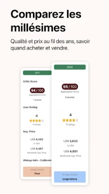 La découverte n'a jamais été aussi intuitive. Grâce à la fonction de reconnaissance d'étiquettes, identifiez instantanément le vin que vous tenez ou saisissez simplement son nom pour accéder à une mine d'informations. Wine-Searcher vous offre des détails essentiels sur le producteur, l'assemblage, la région d'origine, les tarifs disponibles par millésime et les appréciations des critiques renommés. Chaque recherche devient ainsi une occasion d'approfondir vos connaissances et d'effectuer des choix éclairés, qu'il s'agisse d'une nouvelle découverte ou d'un grand classique.